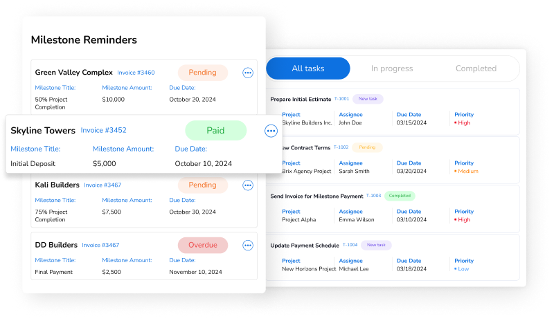Construction project software helps contractors track incoming payments, monitor outstanding invoices, and automate billing. With real time financial insights and automated payment reminders, our software for construction improves cash flow, reduces delays, and ensures accurate reporting – helping builders make better decisions while keeping every construction project on track.